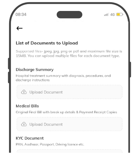 Upload all the required documents as per your type of claim, which include discharge summary, medical bills, consultation papers, KYC documents, lab test reports, a cancelled cheque and other supporting documents (if applicable).